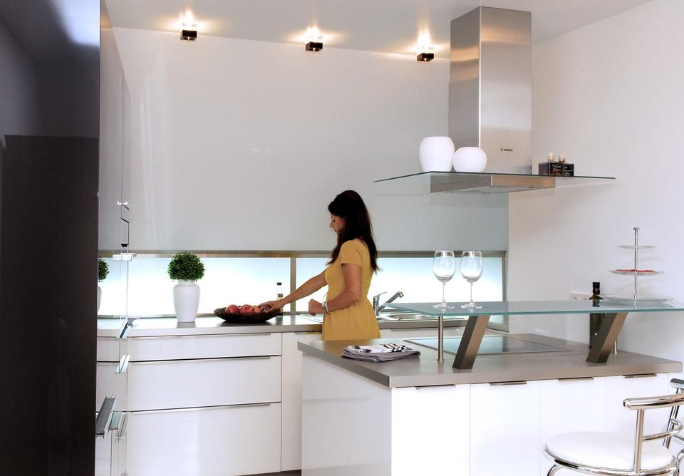 An den Wohnraum schließt sich eine offene, komplett ausgerüstete Küche mit Spülmaschine, Waschmaschine mit Trockner, Gefrier-Kühlschrank und Espresso-Maschine an.
