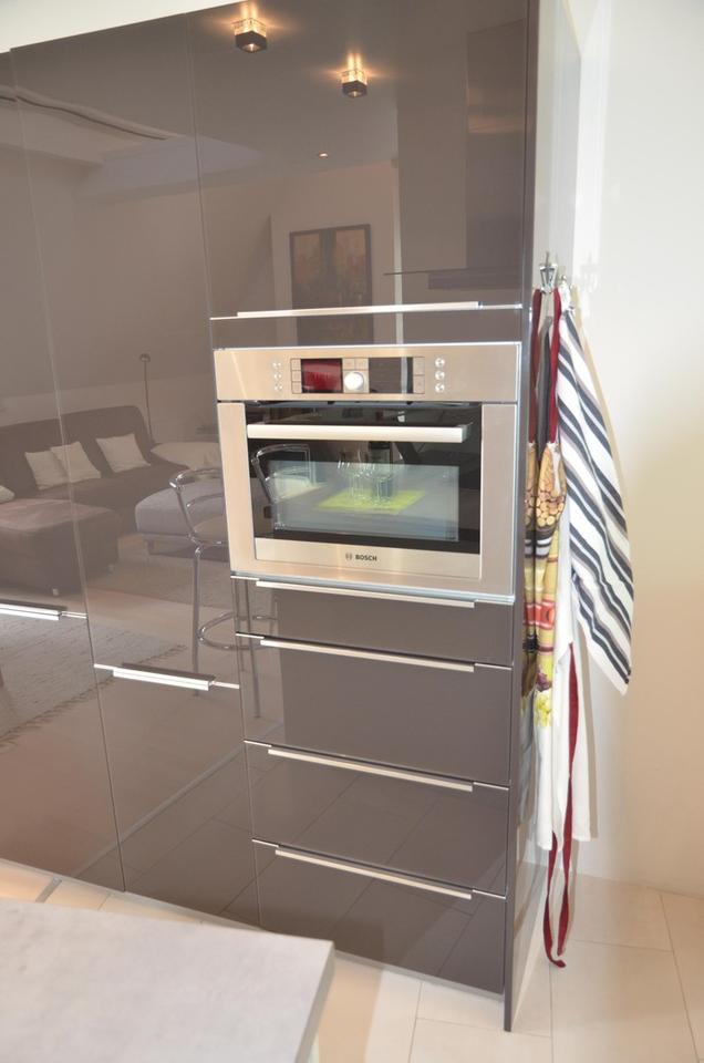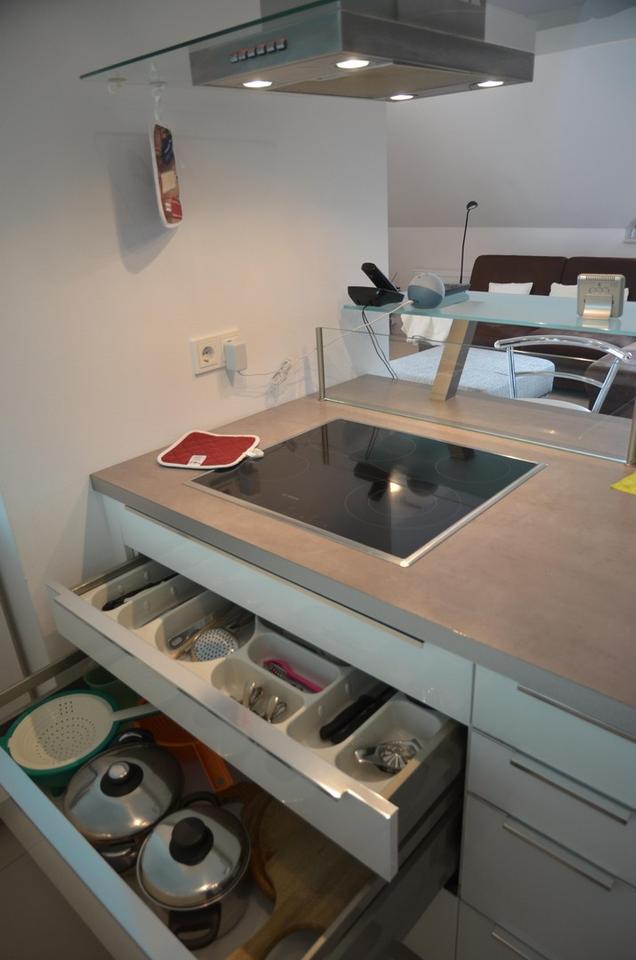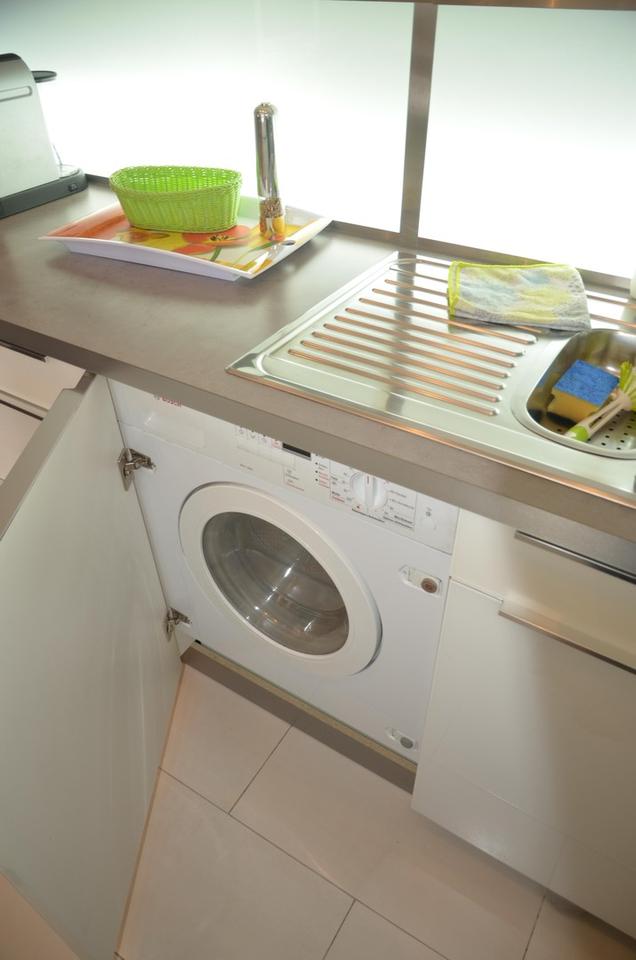 Die Küche hat Spülmaschine, Kühl- und Gefrierschrank, Waschmaschinen- Trocknerkombination, Kochherd mit 4 Platten, einen eine Backofenkombination mit Grill und Mikrowelle, sowie eine Kaffee- und Espressomaschine.