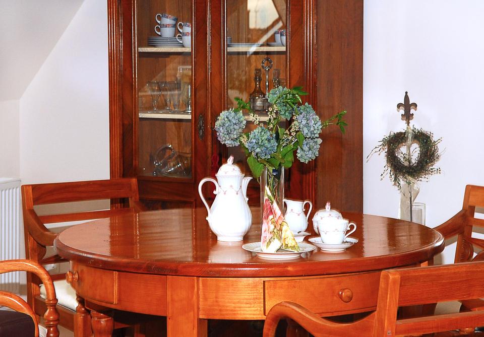Vor dem Eingang und Garderobe öffnet sich der große Wohnraum mit großzügiger Sitzecke und Ottomane, rechts davon befindet sich ein gemütlicher Kaminofen und ein Beistelltisch mit Musikanlage. Der Wohnraum hat außerdem einen runden Eßtisch für 4 Personen. Das Geschirr und die Trinkgläser werden in einem schönen Vitrienenschrank aufbewahrt.