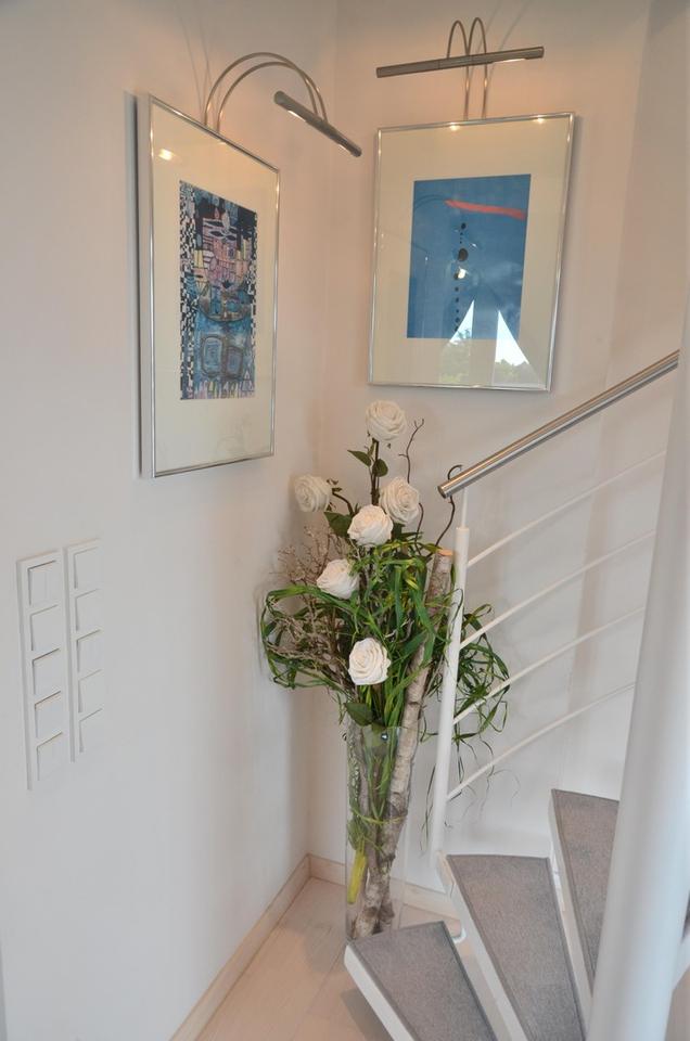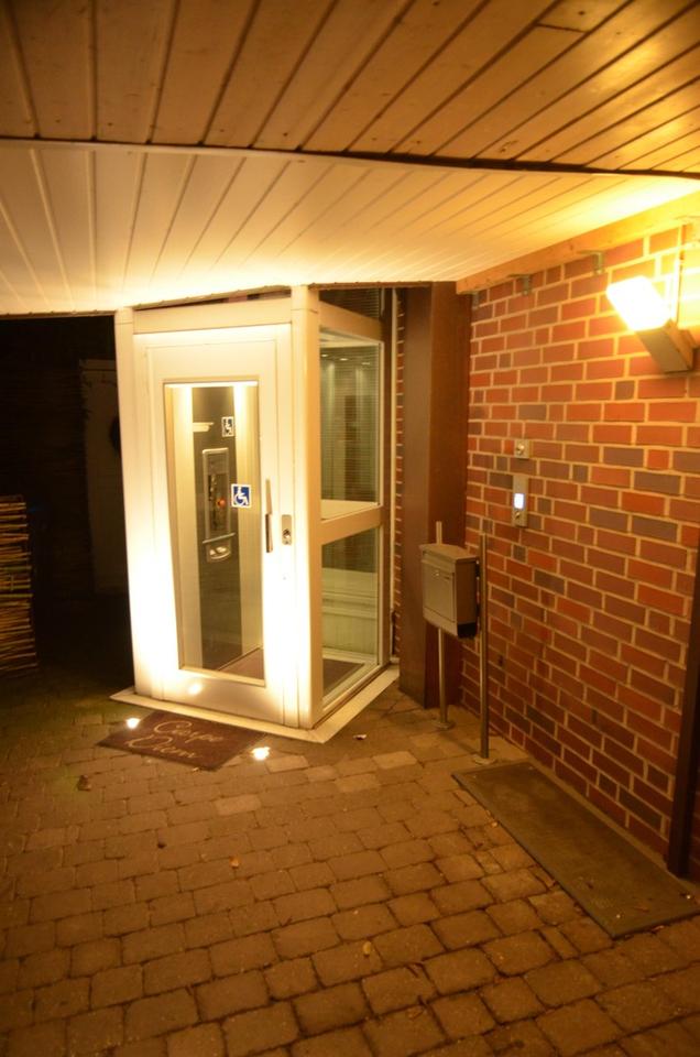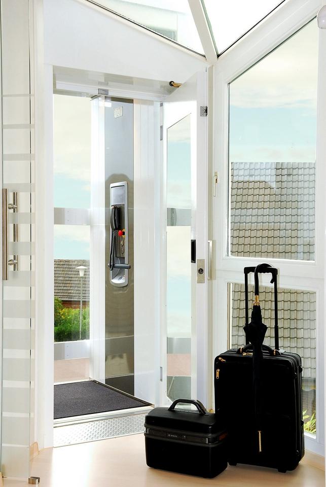 Getrennter Zugang durch carport zum Eingang mit eigenem Fahrstuhl. Am Fahrstuhl-Ausgang im 2. Stock trennt eine Glas-Schiebetür einen kleinen Vorraum zum Wohnraum ab. Rechts vom Eingang befindet sich eine Garderobe mit einem kleinen, begehbaren Garderoberaum mit Schiebetüren.