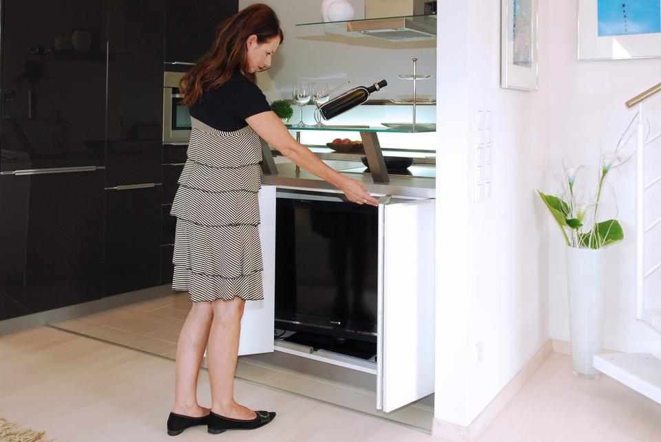 In den Bartresen mit 2 Barhockern, der den Küchenbereich vom Wohnraum abtrennt, ist der großer Fernseher integriert.