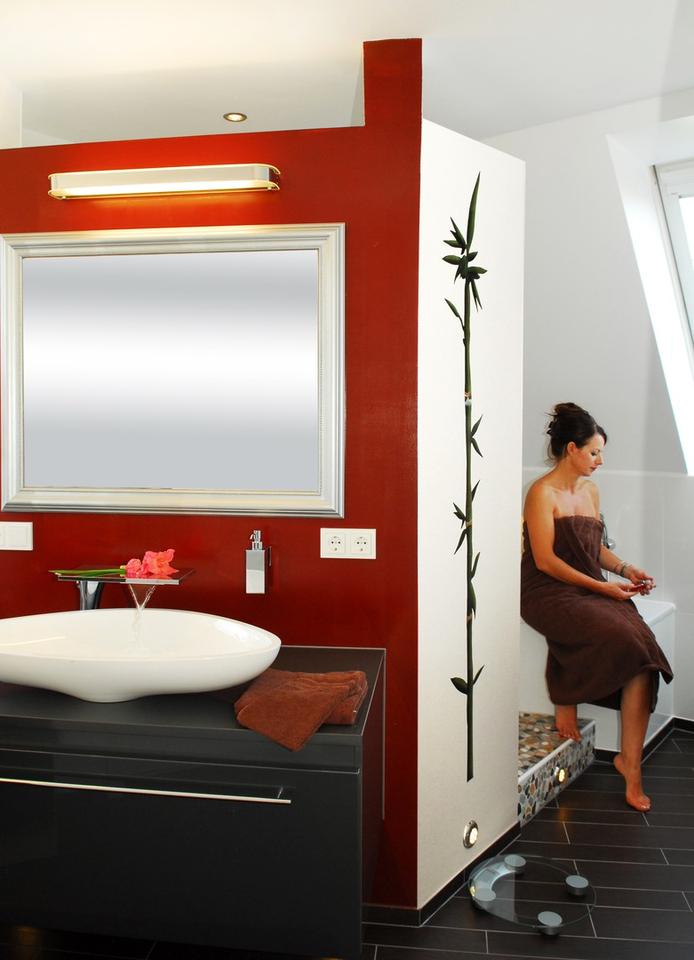 Vom Wohnraum gelangt man durch eine Glas-Schiebtür in das Bad mit großem Waschtisch, Duschecke, Bidet und getrennter Badewanne und in einen großen Umkleideraum mit Kleider- und Wäscheregalen.