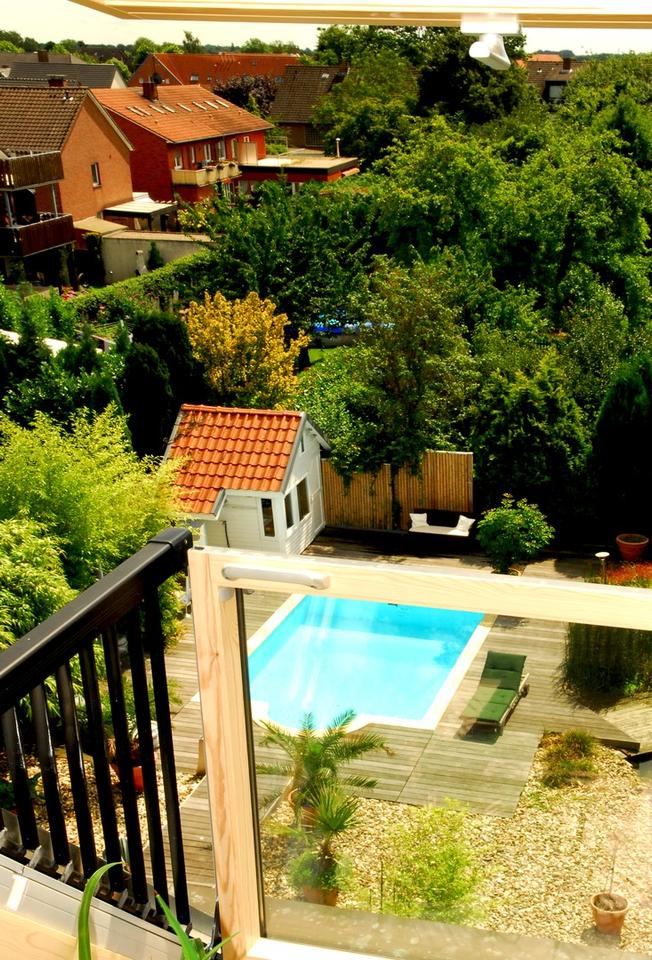 Vom Wohnraum gelangt man über eine freistehende Wendeltreppe zur Galerie, auf der sich zuerst eine Büronische mit einem Schreibtisch befindet und dahinter die Schlafecke mit einem Doppelbett 1,40m breit, einem Beistelltisch mit einem weiteren kleinen Fernseher und einem großen Velux-Variofenster mit Balkongeländer. Von hier hat man den wunderbaren Blick auf den Garten mit Pool und Sauna und die Dächer von Raesfeld.