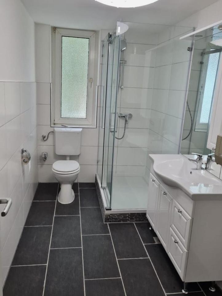 Das 2021 neu gestaltete, moderne Tageslichtbad ist mit einer großen Dusche, einem Waschmaschinenanschluss sowie einem hochwertigen Badheizkörper ausgestattet und vermittelt einen frischen, zeitgemäßen Eindruck.