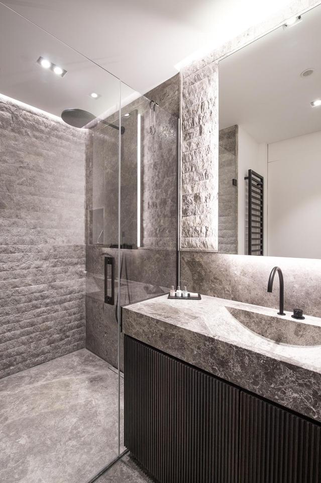 Die Bäder sind mit Traventin Naturstein und Vola Armaturen ausgestattet und lassen keine Wünsche offen. Die Waschtische wurden aus massivem Stein heraus gearbeitet.