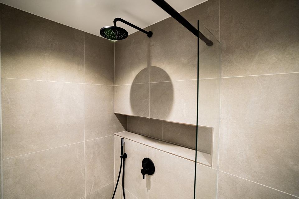 Das Badezimmer wurde wie ein kleiner Spa gestaltet: große Fliesen, eine offene