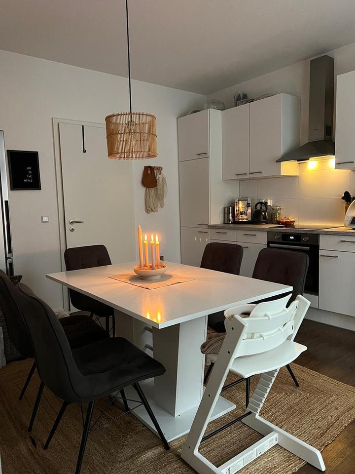 Die schöne große Wohnküche ist das Herzstück der Wohnung. Von hier aus erreicht man den Balkon, der mit kastanienbraunen Dielen aus Bambusholz versehen ist.