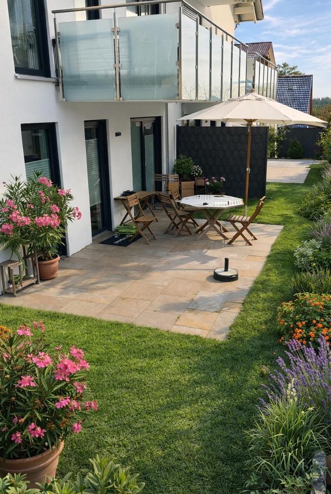 •Großzügige, teilweise überdachte Terrasse mit mediterranem Garten