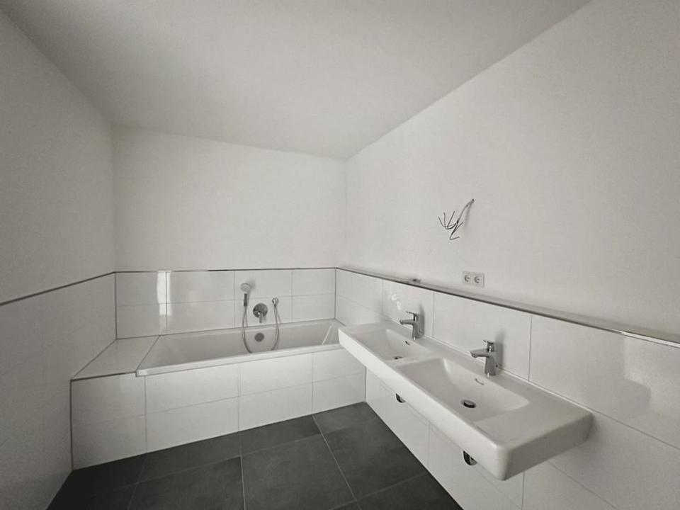 Das Badezimmer ist ein echtes Highlight: Es erwartet Sie eine Badewanne, zwei Waschbecken und eine begehbare Dusche. Die Wandfliesen in edlem Weiß und die Bodenfliesen in zeitlosem Grau verleihen dem Raum eine hochwertige und stilvolle Note. Der gesamte Bereich schafft eine luxuriöse und gleichzeitig entspannte Atmosphäre – ein Ort, an dem Sie gerne Zeit verbringen.