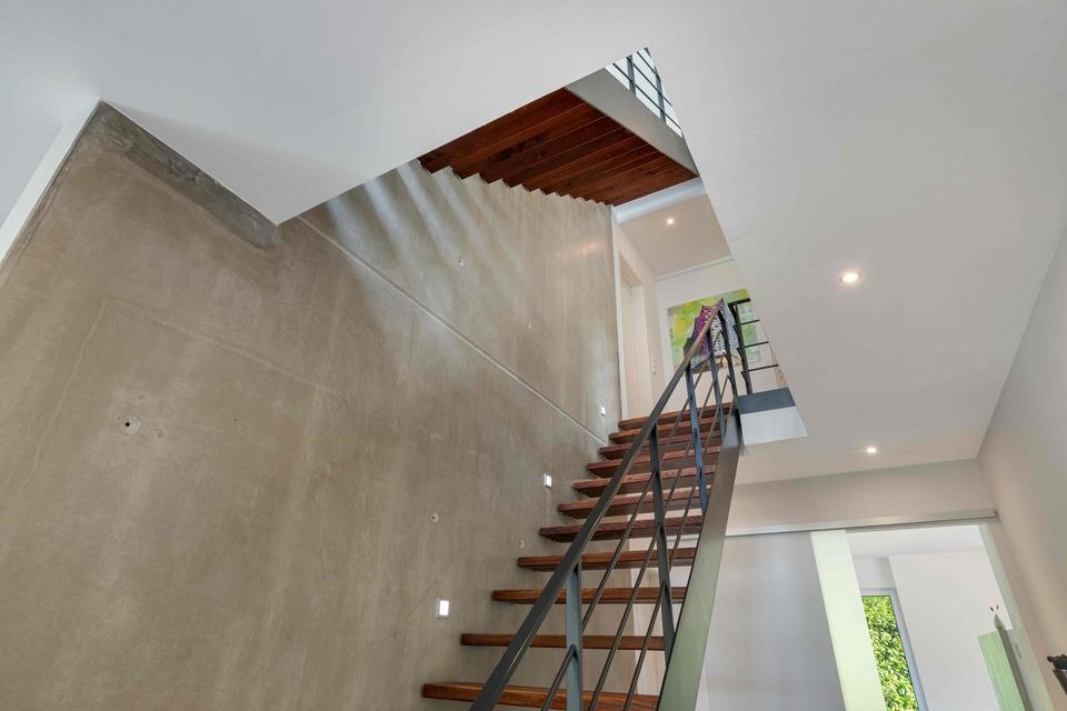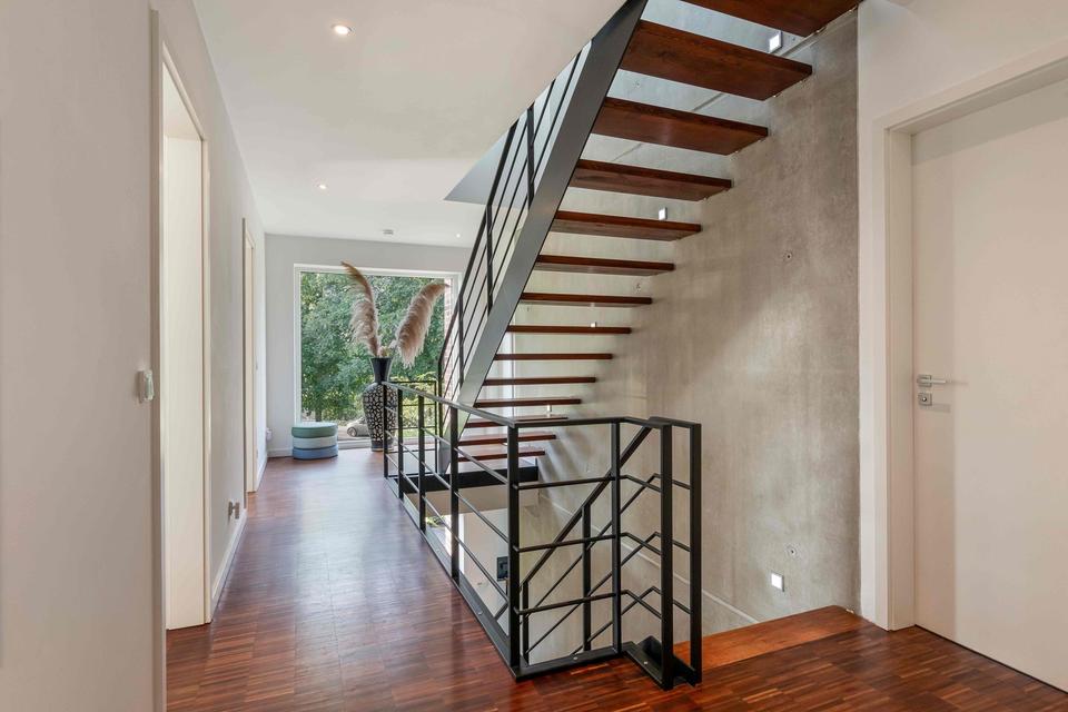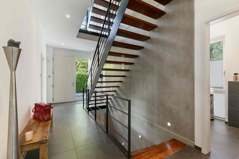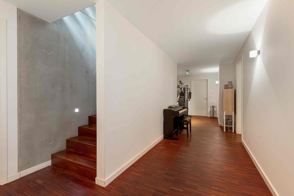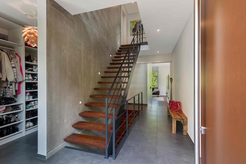 Im weitläufig gestalteten Flurbereich führt eine Treppenanlage mit Stahlwangen und Echtholzstufen, flankiert von einer über alle Etagen reichenden Sichtbetonwand, als architektonisches Highlight in die oberen Ebenen.