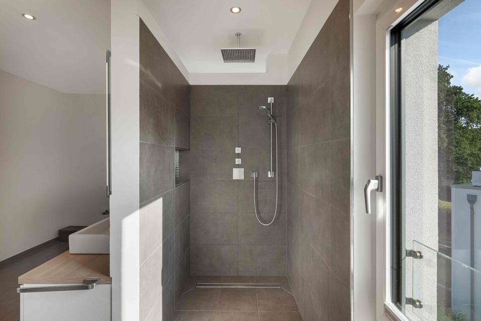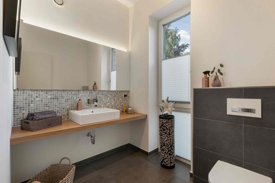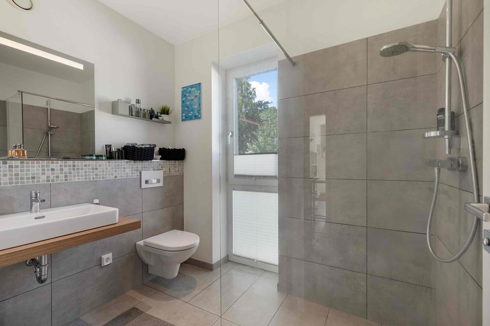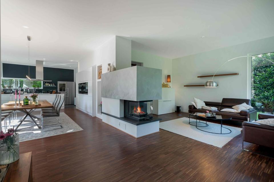 Vier hochwertig ausgestattete Bäder – darunter ein luxuriöses Masterbad mit freistehender Design-Badewanne – sowie ein stilvolles Gäste-WC bieten exklusiven Wohnkomfort. Ein Kamin mit drei Sichtseiten von Spartherm sorgt im offenen Wohn- und Essbereich für besondere Atmosphäre.