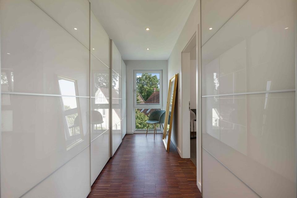 Im Obergeschoss der Kinderetage stehen drei gleichwertig geschnittene Zimmer mit jeweils begehbarem Ankleidebereich sowie zwei moderne Badezimmer zur Verfügung. Ein heller Galerie-Flur verbindet die Räume und schafft ein freundliches, offenes Ambiente.