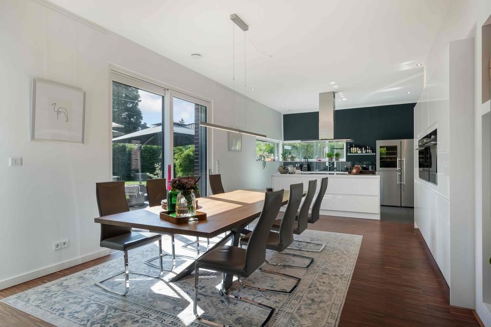 Im Inneren eröffnet sich eine Wohnfläche von ca. 319 m², ergänzt um ca. 22 m² nutzbare Nebenfläche im Untergeschoss. Herzstück des Hauses ist der knapp 70 m² große, offen gestaltete Wohn- und Essbereich mit exklusiver Designküche und Zugang zur sonnigen Südwestterrasse. Großformatige, bodentiefe Fenster lassen Licht und Natur ins Haus und öffnen den Blick in den aufwendig angelegten, blickgeschützten Garten.