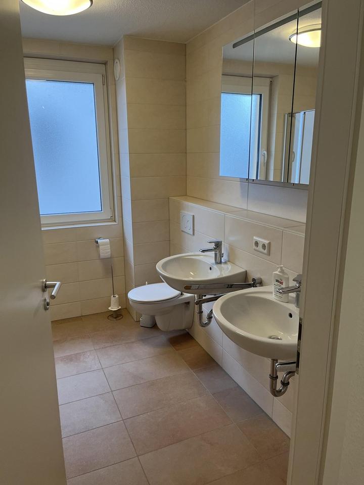 Ein modernes Badezimmer inkl. Dusche und Badewanne sowie zwei Waschbecken runden das Gesamtbild ab. Das WC ist separat. Für ein angenehmes Wohnklima sorgt die Fußbodenheizung und Lüftungsanlage mit Wärmerückgewinnung. Beide Aspekte in Verbindung mit der modernen Bauweise führen zu sehr niedrigen Heizkosten (Energieklasse A).