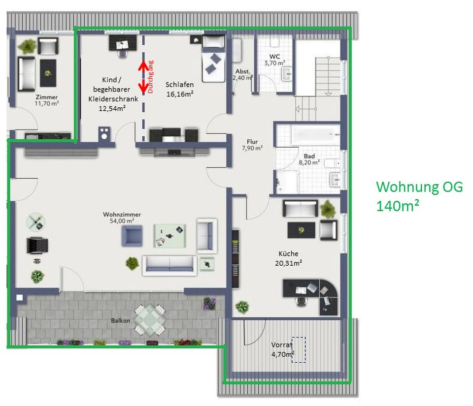 Über den Flur erreicht man ein großes Tageslichtbad mit Dusche und Badewanne, welche zum Entspannen einlädt, sowie ein Gäste-WC. Der Waschmaschinenanschluss befindet sich ebenfalls im Tageslichtbad. Die sehr geräumige Küche bietet ausreichend Platz für einen Essbereich. Zur Wohnung gehört eine Markenküche des Herstellers Nolte, welche in der Kaltmiete inkludiert ist. Der Schlafbereich ist mit einem begehbaren Kleiderschrank / Kinderzimmer verbunden. Falls gewünscht, ist eine Trennung jederzeit realisierbar. Das Highlight der Wohnung ist das über 50m² große Wohnzimmer mit angeschlossenem Balkon, wo sie den Abend ausklingen lassen können. Es besteht die Option zur Teilung des Wohnzimmers zwecks Schaffung eines weiteren Zimmers. Zusätzlich stehen zwei Abstellräume zur Verfügung.
