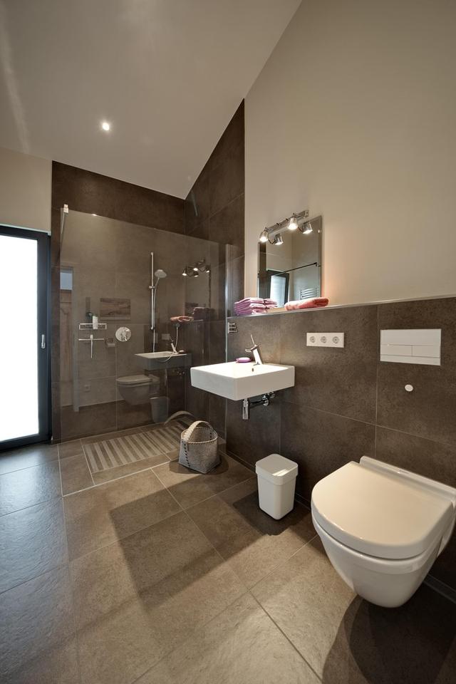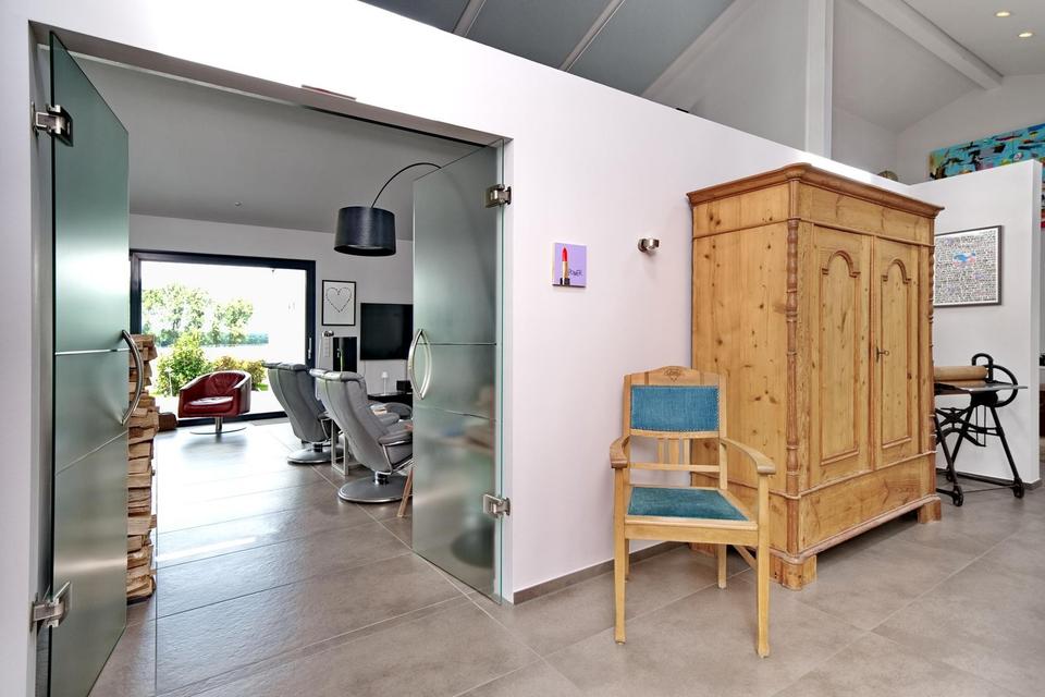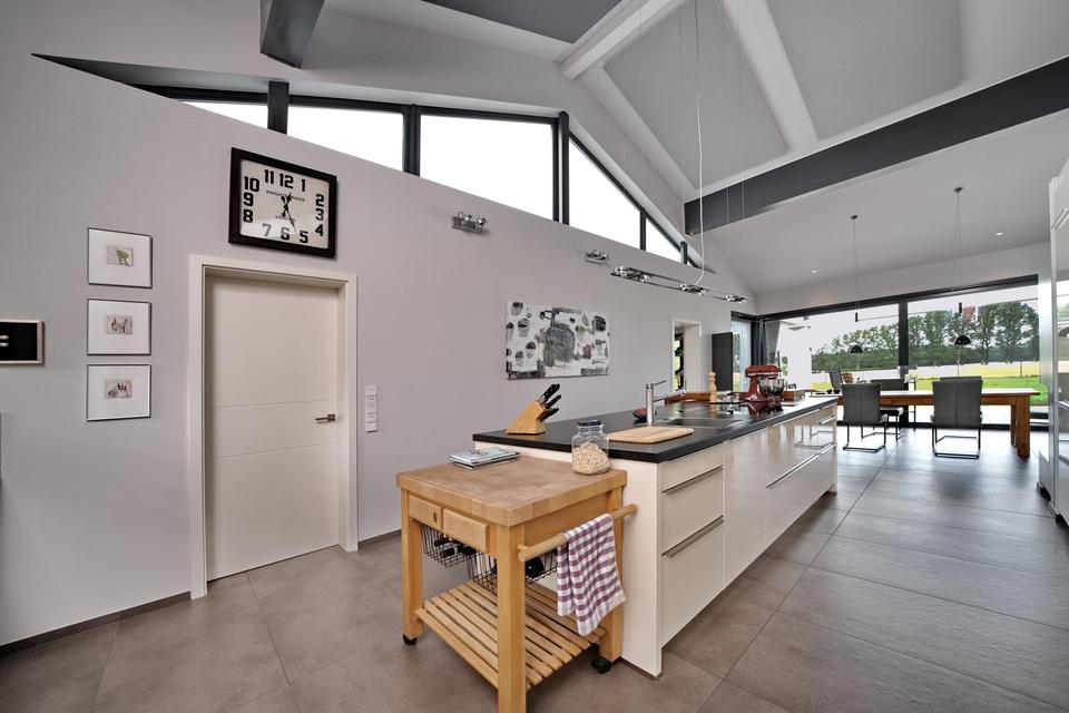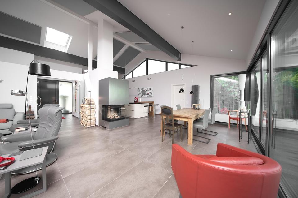 Das Haus ist vollständig barrierefrei gestaltet – ideal für Menschen, die Komfort und Zukunftssicherheit vereinen möchten. Alle Räume befinden sich auf einer Ebene: Wohnen, Schlafen, Arbeiten und Entspannen ohne Stufen. Der rund 80 m² große Wohn-/Essbereich öffnet sich über eine 7 Meter breite Fensterfront zur geschützten Terrasse. Ein dreiseitig einsehbarer Design-Kamin von Harke schafft ein behagliches Ambiente.