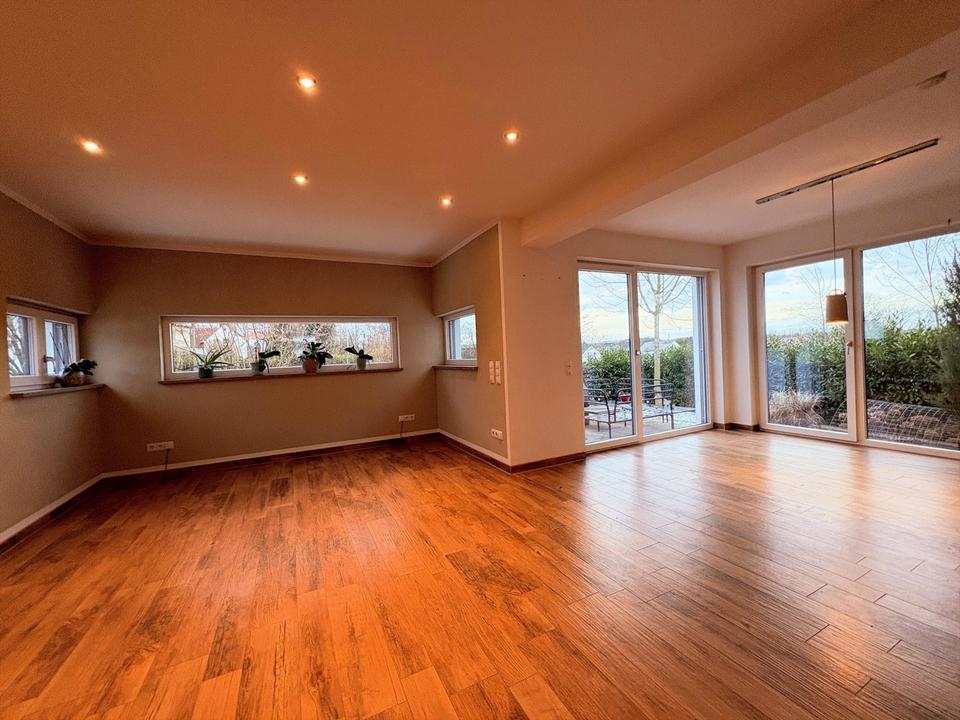 • Heller, moderner und großzügiger Wohn-Essbereich mit bodentiefen Fenstern