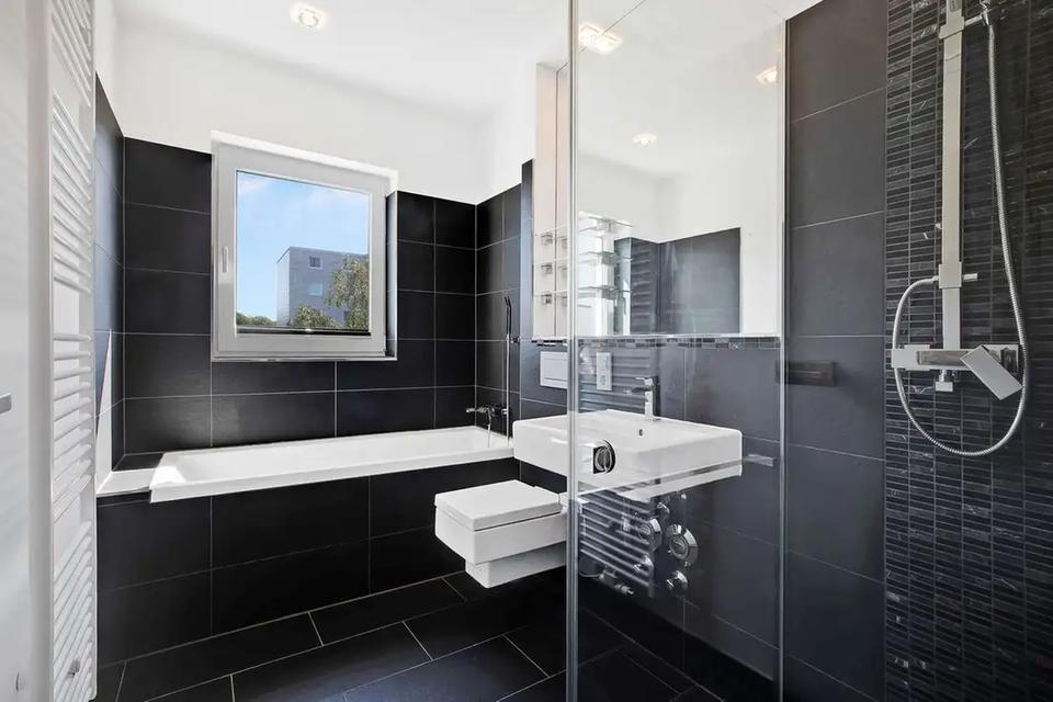 Das Badezimmer überzeugt mit einer hochwertigen Ausstattung, Dusche und Badewanne. Ein praktischer Einbauschrank sorgt für zusätzlichen Stauraum.