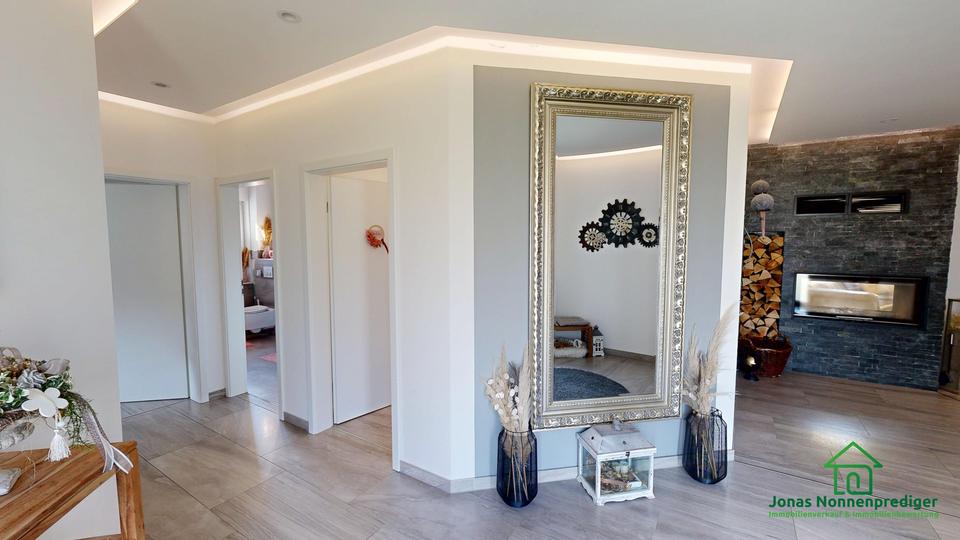 Die Immobilie überzeugt durch eine Vielzahl an Extras: ein Tunnelkamin sorgt für behagliche Wärme sowie elegante Optik, während eine 22 kWp Photovoltaikanlage einen nachhaltigen Energiebeitrag leistet. Eine moderne Einbauküche, eine Wasserenthärtungsanlage sowie elektrische Außenrollos ergänzen die hochwertige Ausstattung. Für zusätzlichen Komfort sorgt ein Whirlpool. Beheizt wird das Haus über eine energieeffiziente Weishaupt-Wärmepumpe mit Fußbodenheizung. Für Kinder steht ein schöner Spielplatz im Garten zur Verfügung.