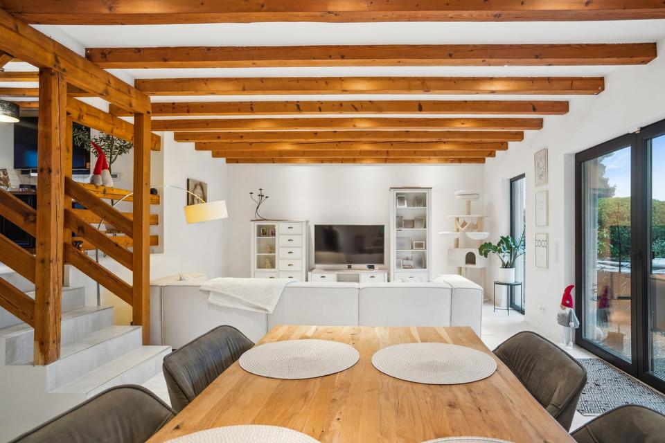 Im Inneren überzeugt das Haus durch helle Räume, eine offene Wohnküche mit Einbauküche, modernisierte Bäder sowie einen Kamin, der an kühleren Tagen für wohlige Wärme sorgt.
