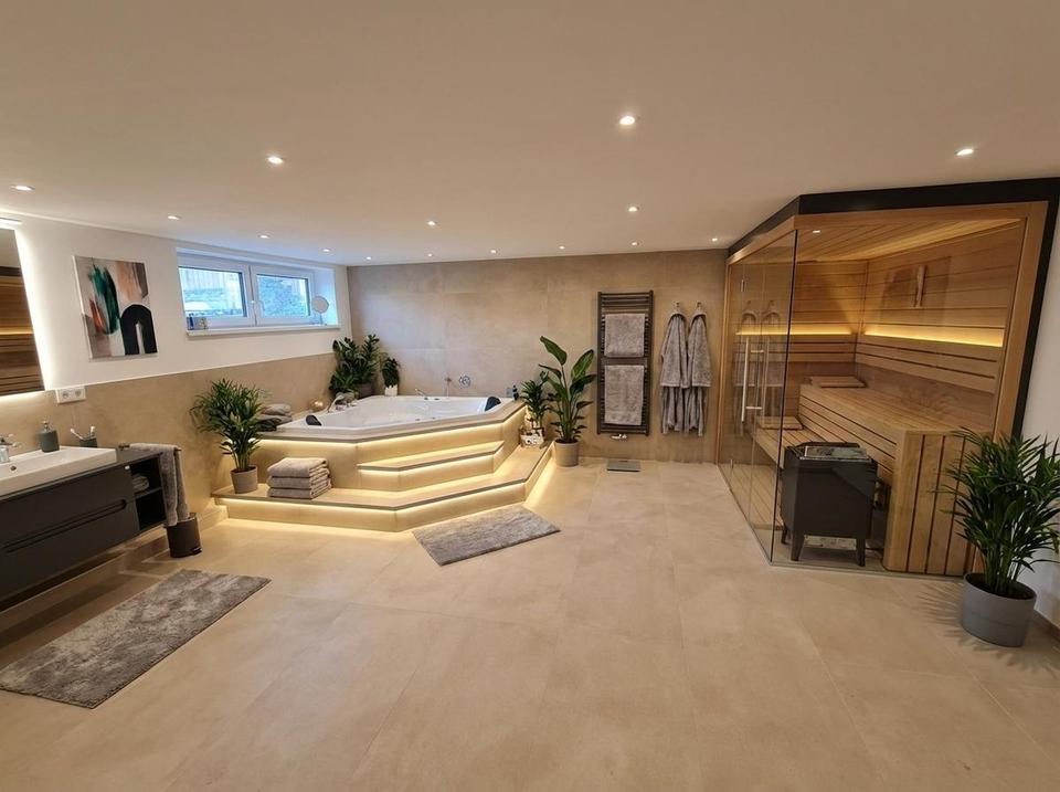 Um Ihnen das volle Potenzial dieser Räume aufzuzeigen, wurden die Bilder mittels „Virtual Staging“ digital möbliert. Bitte beachten Sie, dass die visualisierten Einrichtungsgegenstände (wie der dargestellte Whirlpool, die Sauna, die Kücheninsel oder spezielle Einbauschränke) nicht Teil des Angebots sind. Übergeben wird das Haus im frisch renovierten und unmöbilirten Zustand, inklusive der oben beschriebenen Küchenzeile (ohne Kochinsel).