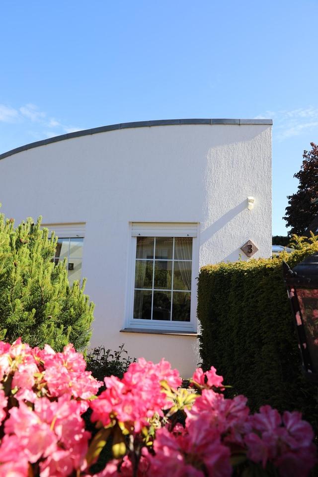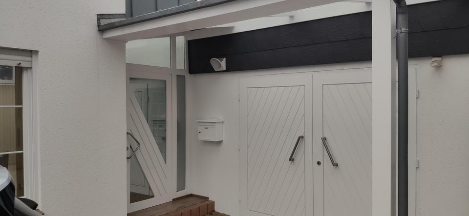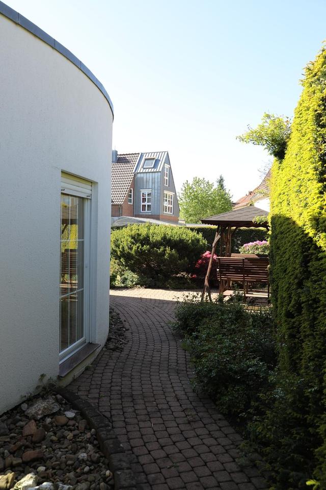 Besonders praktisch ist der barrierefreie Nebeneingang, der das flexible Erreichen des Hauses erleichtert. Der 2022 mit neuer Markise modernisierte Glas-Zwischengang verbindet die Bereiche des Hauses nicht nur funktional, sondern schafft auch ein lichtdurchflutetes architektonisches Highlight.