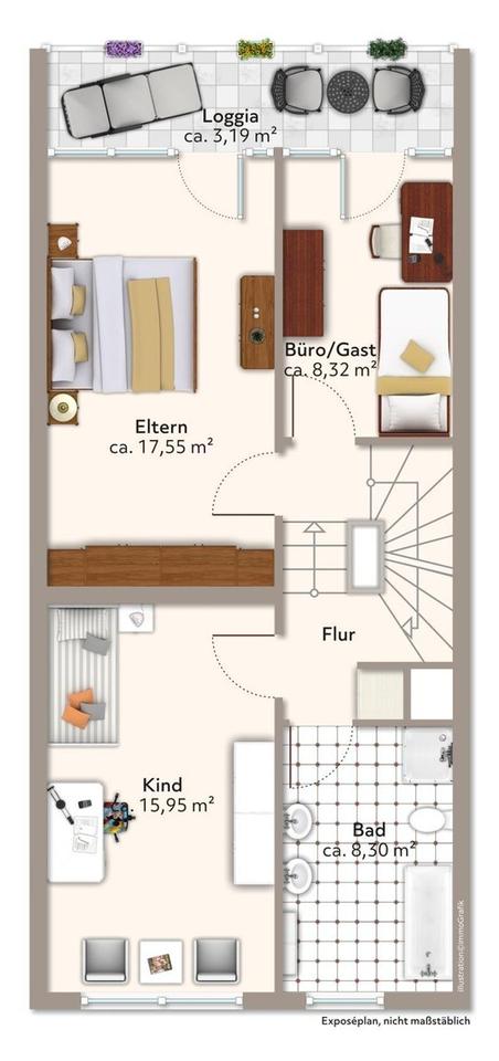 Im Obergeschoss befinden sich zwei mögliche Schlafzimmer sowie ein Büro. Ergänzt wird diese Ebene durch ein praktisches Wannenbad und einen Südbalkon.