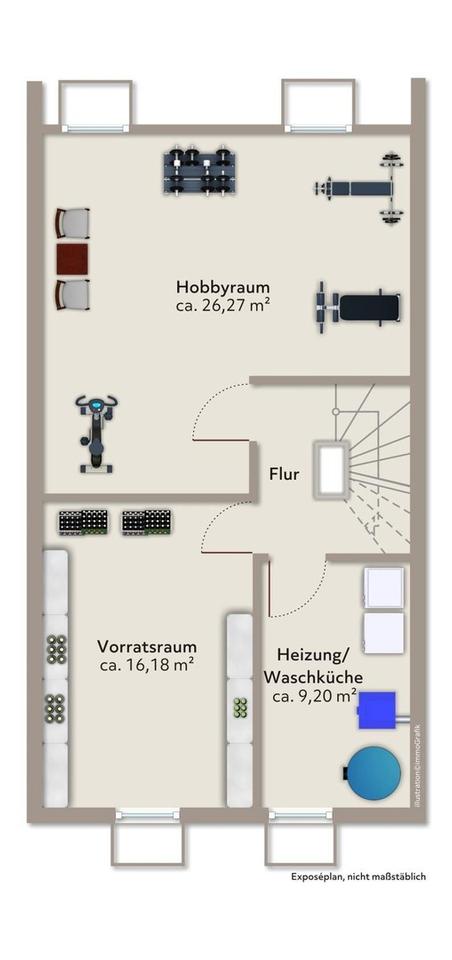 Im Kellergeschoss befinden sich ein Heizungs- und Waschraum, ein Vorratskeller sowie ein großzügiger Hobby- bzw. Sportraum.