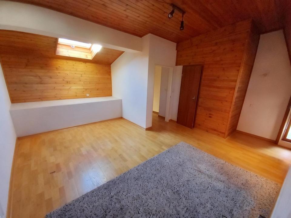 Ein besonderes Highlight ist das Studio im Dachgeschoss, das als eigenständiger Rückzugsort dient. Es verfügt über einen hohen, großzügigen Raum mit Holzvertäfelung, einen zusätzlichen Kriechkeller sowie ein eigenes Gäste-WC mit Dusche. Damit eignet es sich ideal als Elternbereich oder komfortables Gästezimmer.