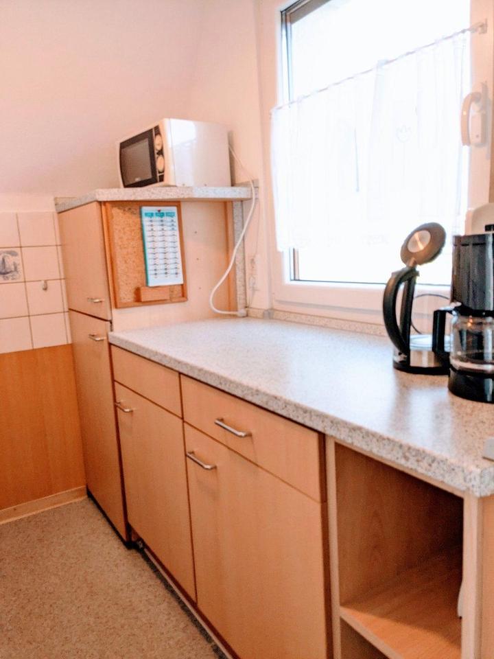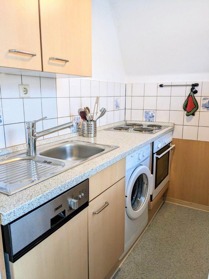 Die Küche ist voll ausgestattet mit: Backofen, Herd, Geschirrspüler, Waschmaschine, Kühlschrank mit Gefrierfach sowie Mikrowelle, Wasserkocher und Kaffeemaschine, etc.