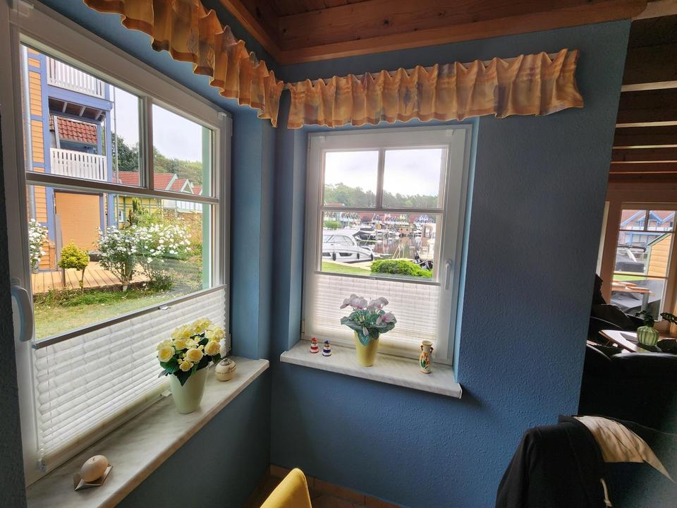 Im Erdgeschoss befindet sich der offene Wohnbereich mit Ofen, Küche, Gäste-WC Essbereich im Erker, Garderobe und Aufgang zum Obergeschoss, in dem sich zwei Schlafräume und das Badezimmer mit Dusche und Wasseranschluss für die Waschmaschine befinden, die sehr gut belichtet sind. Durch die Süd- Ostausrichtung blicken Sie auf die Wasserfläche der Hafenanlage, welches durch die teilweise vorhandenen bodentiefen Fenster noch begünstigt wird.