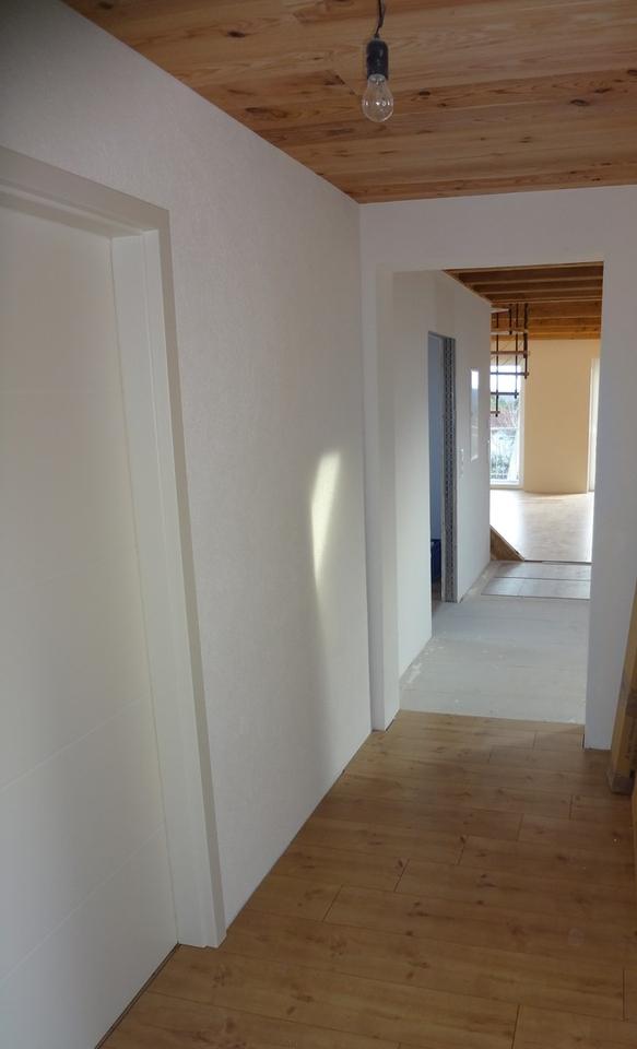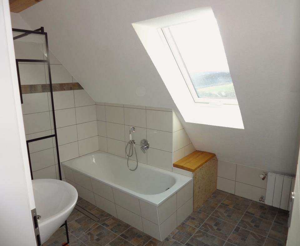 Umbau eines Bauernhauses durch einen Handwerksmeister. Die Wohnung ist komplett neu in der ehemaligen Scheune enstanden. Ökologische Bauweise, Holzfaserdämmung mit Mineralputz, viel unbehandeltes Holz. Neues Tageslichtbad mit Badewanne und Walk-In Dusche.