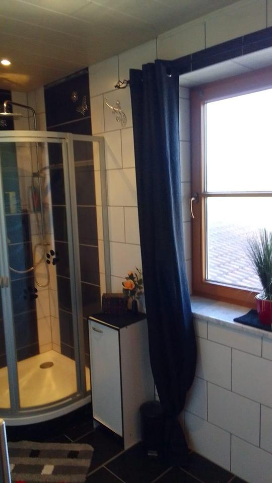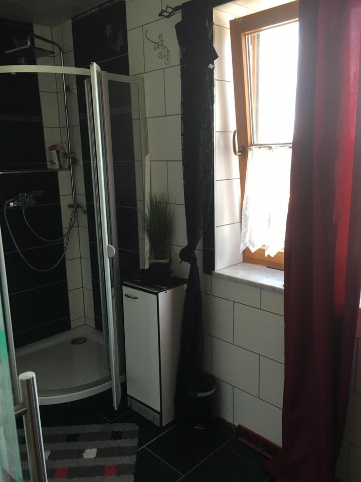 Ebenso würde in dem grossen , schwarz-mint farbenen Bad der riesige Bad-Hängeschrank mit im Haus verbleiben, falls gewünscht (hier war der Neupreis ca 8000€)