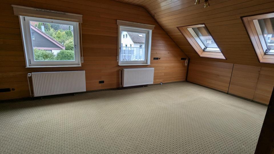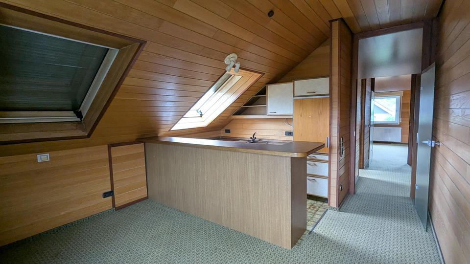 Über eine Treppe gelangen Sie in das ausgebaute Dachgeschoss. Dort erwartet Sie ein großzügiges, lichtdurchflutetes Studiozimmer, das sich ideal als Hauptschlafzimmer, Homeoffice oder Hobbyraum eignet. Helle Holzverkleidungen an Wänden und Decken sorgen für eine warme, einladende Wohnatmosphäre. Ergänzt wird diese Etage durch eine kleine Pantry-Küche mit Theke, ein weiteres Badezimmer mit Badewanne, Dusche und Dachfenster sowie ein zusätzliches Zimmer, das sich hervorragend als Kinder- oder Gästezimmer nutzen lässt.