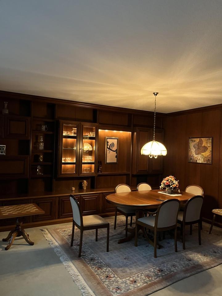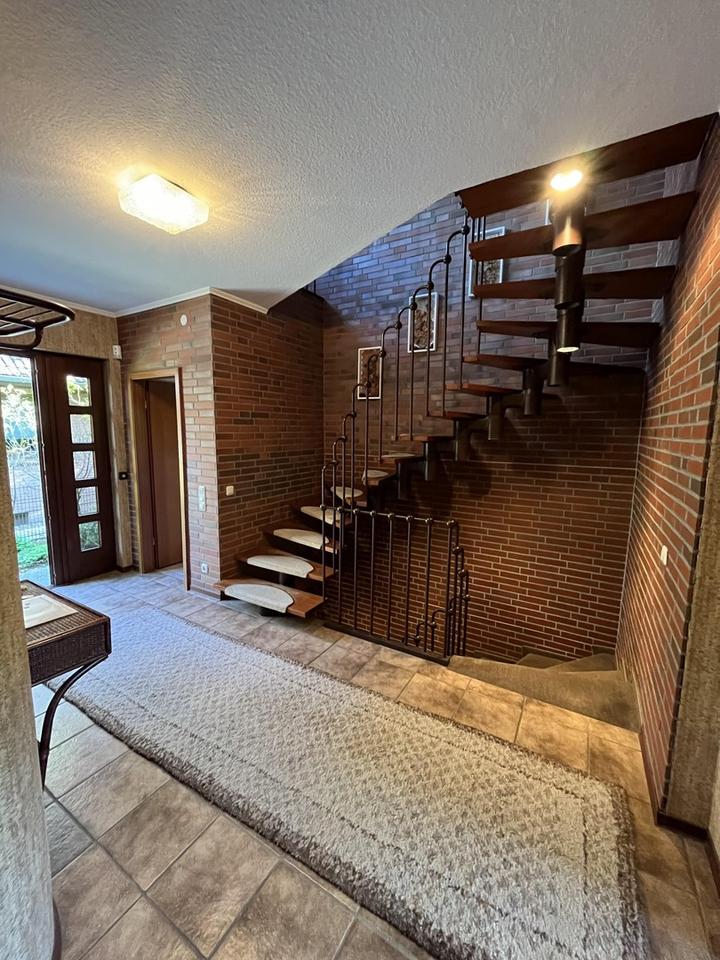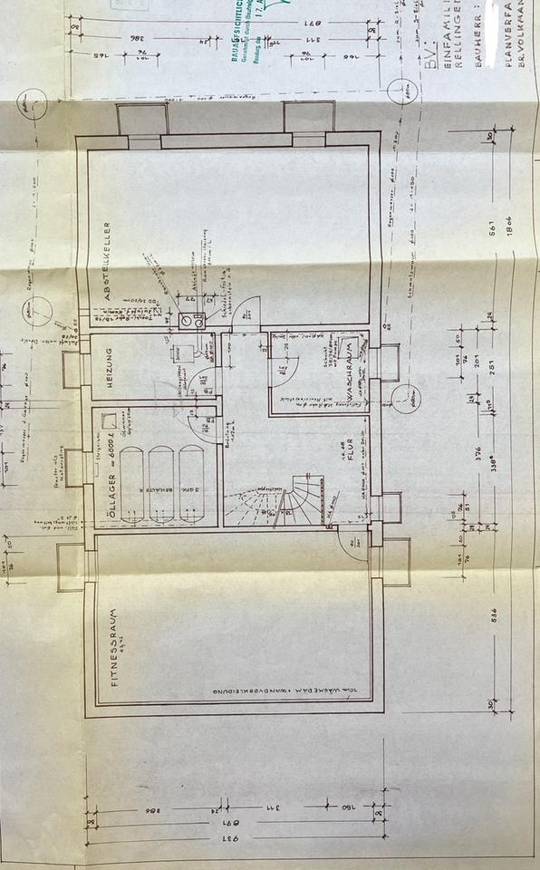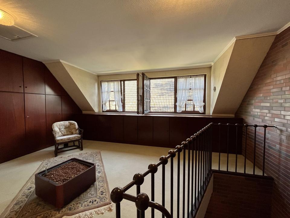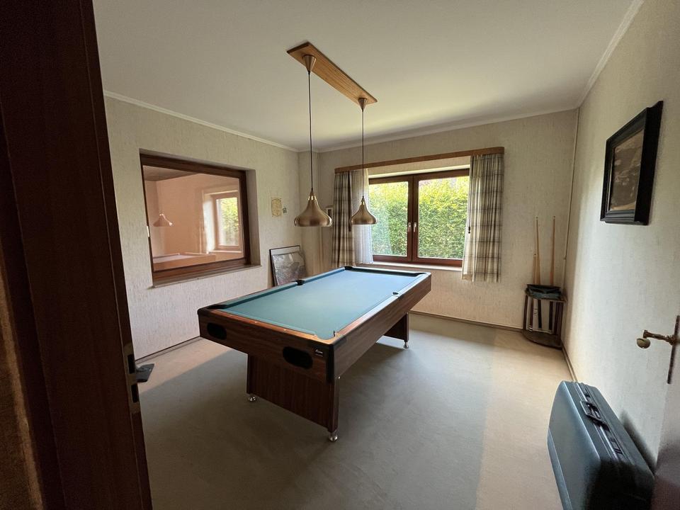 Ein besonderes Augenmerk verdient der im Keller gelegene Fitnessbereich mit viel Tageslicht und einer Deckenhöhe von fast 5,50 m! Ein großes Trampolin, sowie Fitnessgeräte der 80er Jahre haben dort ihren Platz gefunden. Dieser fast 45 m² große Bereich ist nicht Teil der Wohnflächenberechnung!