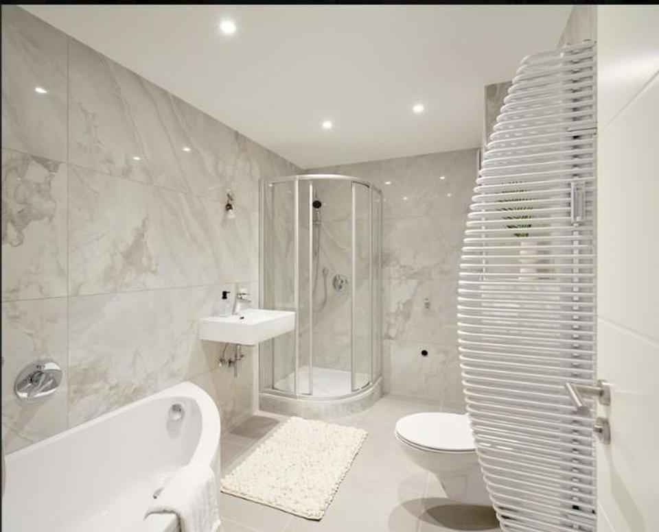 • Modernisiertes Badezimmer mit großzügiger Dusche und Badewanne