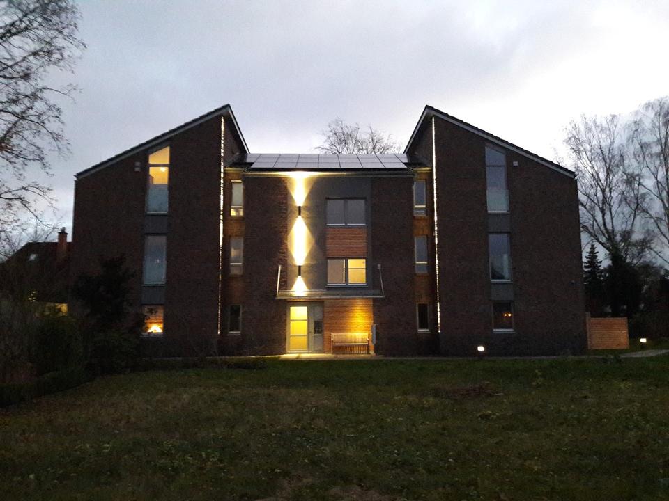 Rechnerisch wird die gesamte für das Haus benötigte Energie regenerativ über Fotovoltaik, Luftwärmenutzung und Luft/Wasser-Wärmepumpe erzeugt. Dadurch erlangt das Haus eine in der Bilanz nahezu vollständige Eigenversorgung (jahreszeitliche Abweichungen). Die Heizwärme wird über elektrische Fußbodenheizung im gesamten Gebäude sowie die Luftwärmerückgewinnung, das Warmwasser über die elektrisch betriebene Luft/Wasser- Wärmepumpe erzeugt. Ein wesentlicher Anteil der für die Wohnungen erforderlichen Heiz- und Warmwasserenergie sowie für den Stromverbrauch wird den Mietern über einen niedrigen Strompreis für den PV – Strom angeboten (optional). Dieses innovative und nachhaltige Konzept sichert Ihnen als Mieter langfristig niedrige und stabile Verbrauchs- und Stromkosten (s. Wärmeschutznachweis).