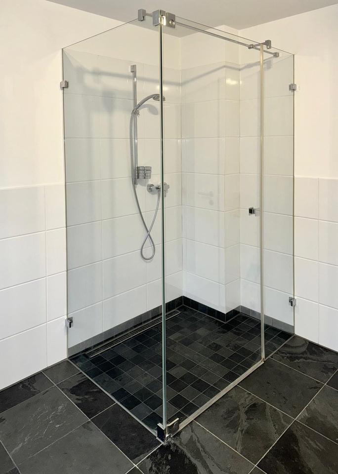 Das Bad verfügt über eine große, ebenerdige Dusche mit Echtglaswand, eine Badewanne, Toilette sowie 2 separate Waschbecken.