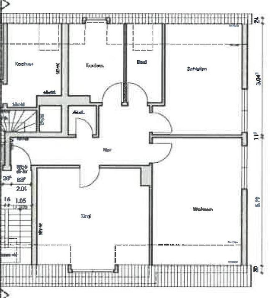 Durch den Flur gelangt man in die sehr große Diele, von welcher das Tageslichtbad mit Dusche/Wanne und Wohnbereich sowie Kinder- und Schlafzimmer abzweigen. Durch die großen Fenster gelangt viel Licht in die Räumlichkeiten
