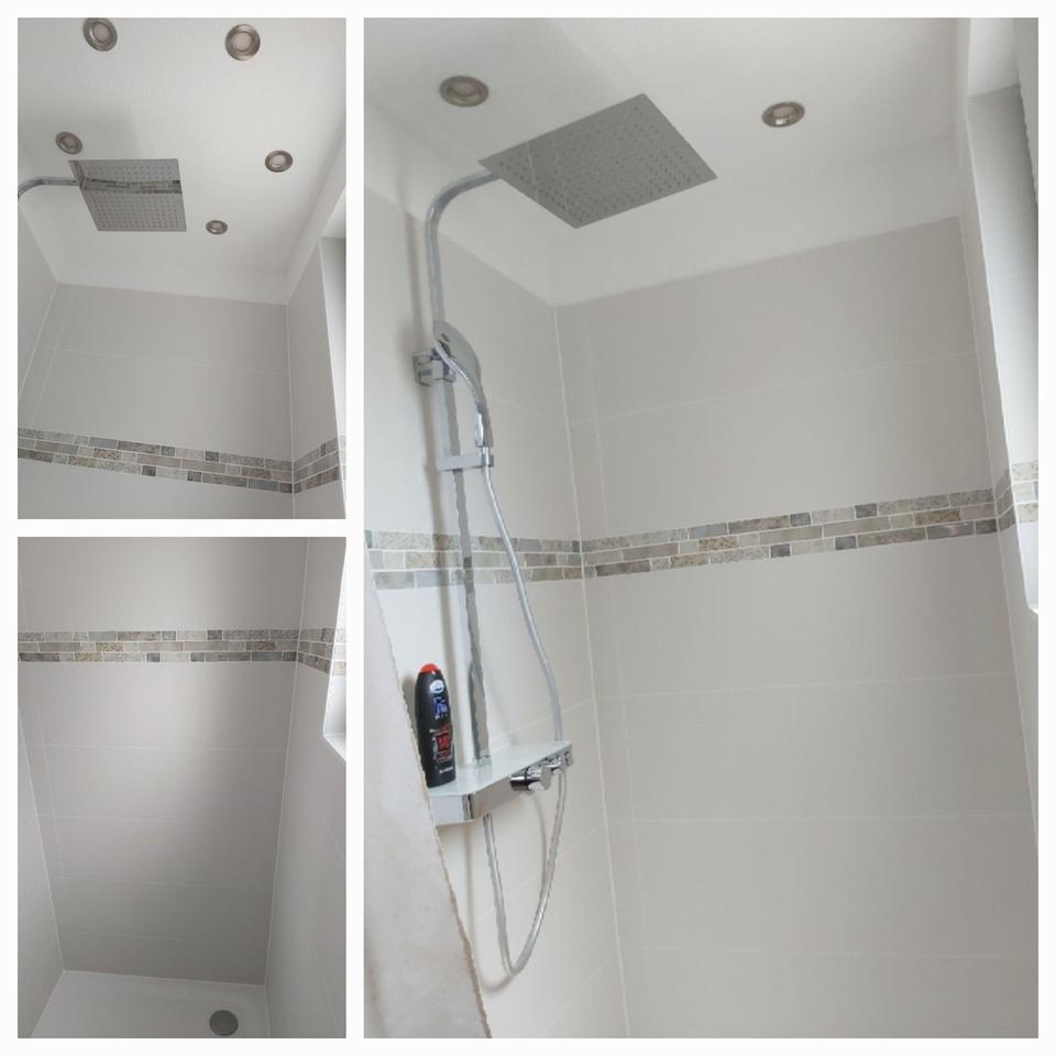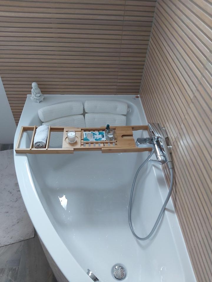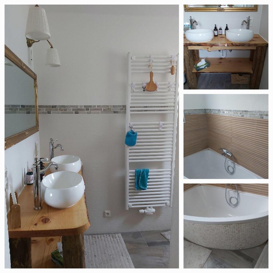 schöner Flur mit Aufgang zum Obergeschoss; sehr schönes Bad mit begehbarer Dusche, Spa-Badewanne, Waschtisch aus Altholz mit zwei Waschbecken; separates WC; Zugang zum Keller; gemütliches Schlafzimmer; gemütliche Wohnküche mit Esszimmer und Zugang zur großen teilweise überdachten Terrasse; Wohnzimmer