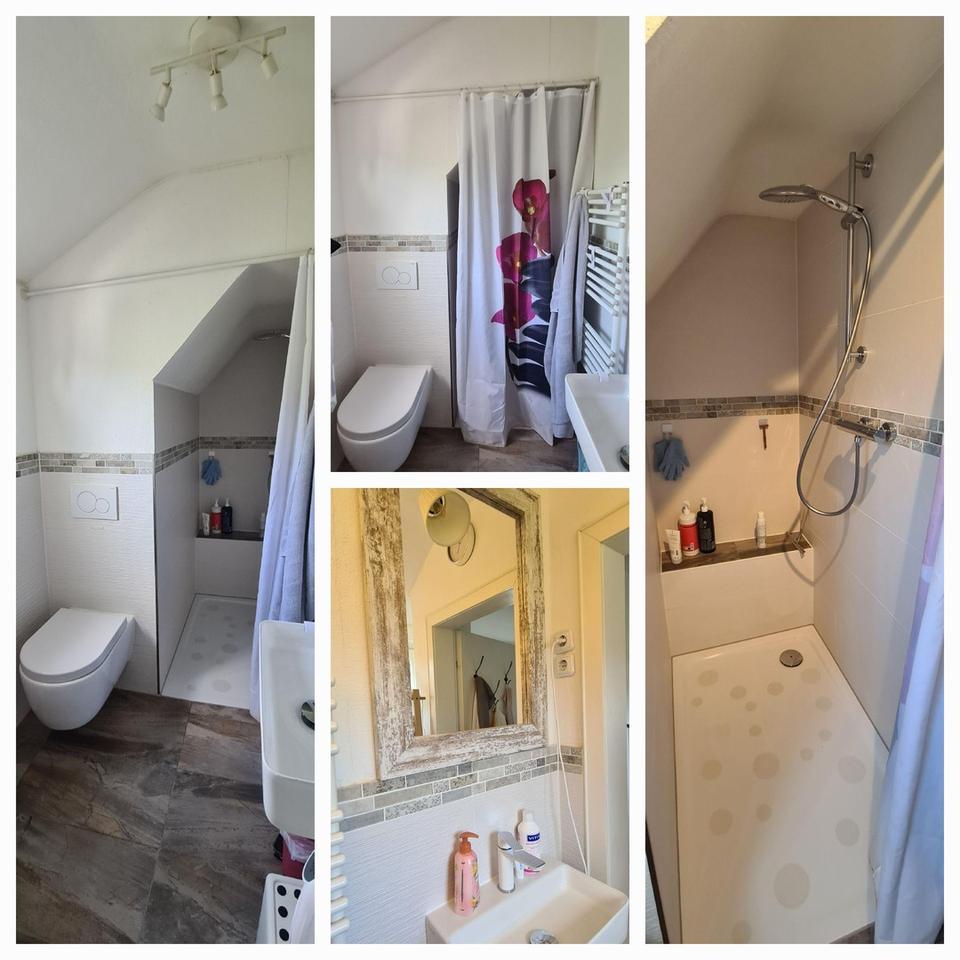 Obergeschoss: Zimmer 1 mit kleinem Zusatzzimmer; Zimmer 2, Zimmer 3 (derzeit als Büro und Gästezimmer genutzt); Badezimmer mit WC und begehbarer Dusche und Waschbecken; kleiner Flur mit Zugang zum Dachboden (großzügiger Speicher oder aber auch zum Ausbau geeignet). Beide Geschosse haben je ca. 67 qm Wohnfläche.