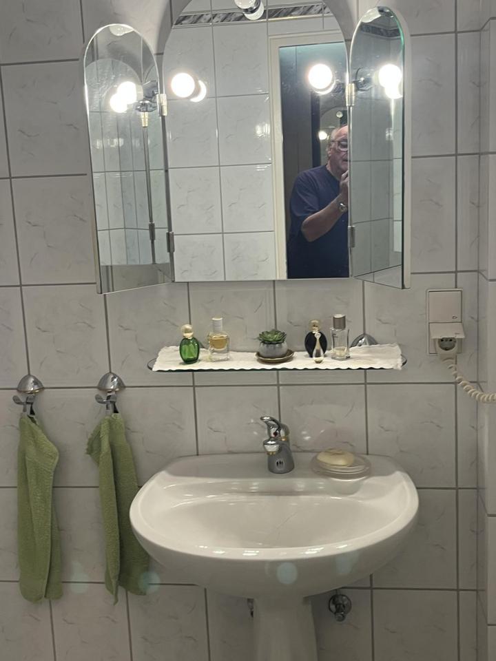 Die offen gehaltene Küche kann mit übernommen werden, ist aber kein muss, Sie ist bereits älter und kann auf Wunsch entfernt werden. Das Bad im DG verfügt über eine Wanne sowie einer Dusche, zusätzlich gibt es hier 2 Säulenwaschtische, so dass sich 2 Personen gleichzeitige für den Tag herrichten könnten. Durch 2 Dachflächen Veluxfenster bekommt auch das Badezimmer sehr viel Tageslicht. Ein WC und ein Bidet vervollständigen das Bad. Im EG ist ein Gäste Bad mit Waschtisch und WC, alle Sanitärgegenstände stammen aus dem Ursprungsbaujahr.