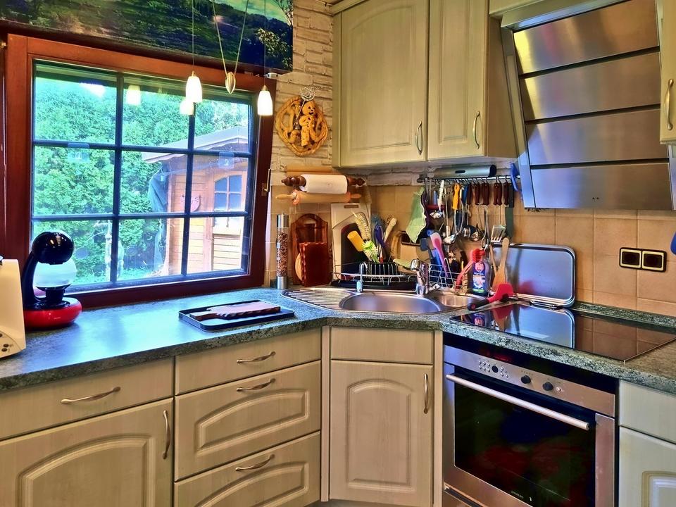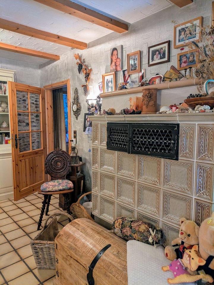 Kachelofen (Kaminofeneinsatz 2013 erneuert, Schornstein um Edelstahlaufsatz erweitert und dadurch weiterhin mit Betriebserlaubnis)