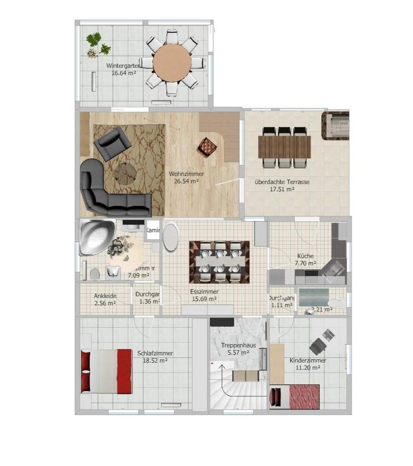 Ankleide, Bad und Gäste-WC mit Fenster, Küche und Wintergarten.
