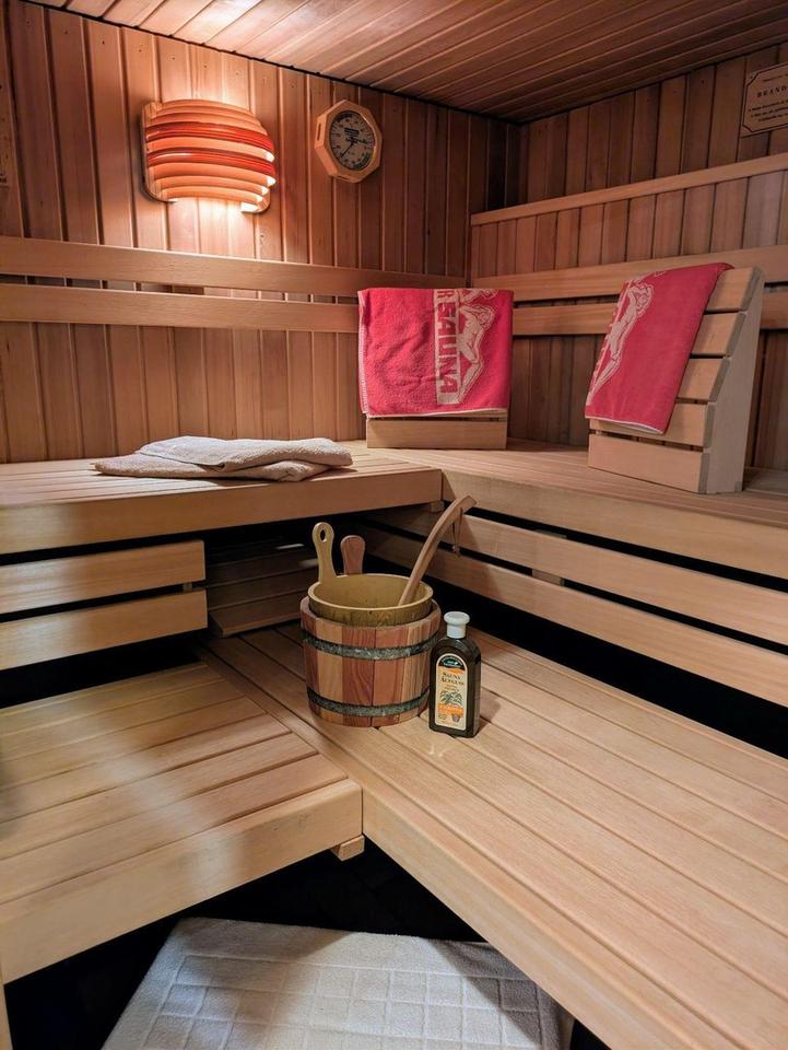 Wellnessbereich mit Sauna und großer Dusche Badezimmer mit Whirlpool Badewanne