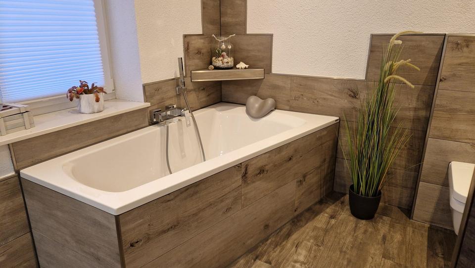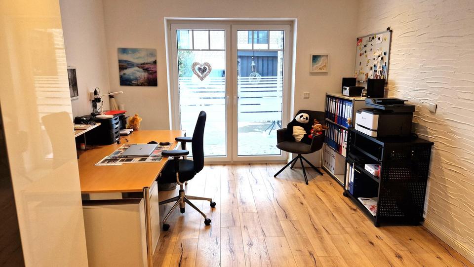 Der Wohn-, Ess- und Küchenbereich, Flur, Vollbad, Hauswirtschaftsraum, Gäste-WC, Speisekammer sind gefliest (Feinsteinzeug). Die weiteren Zimmer haben einen Laminatboden.