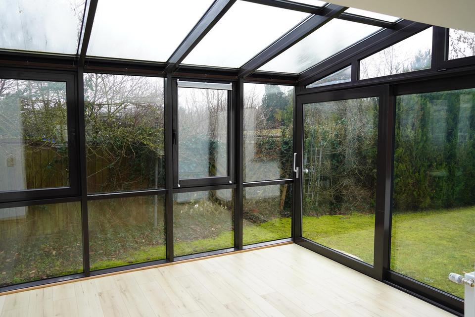 EG: Flur/Gäste-WC/Küche/Esszimmer mit Zugang zum Wintergarten/Wintergarten mit Zugang zum Garten/Schlafzimmer/Wohnzimmer/Waschküche