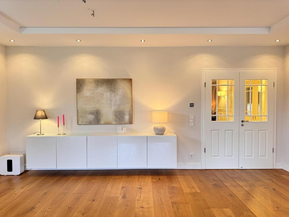 Vom Flur gelangt man sowohl in die sehr große, offene Küche als auch in den weiten Wohn- und Essbereich mit Kamin. Zwei übergroße Schiebeelemente zum Garten sowie zwei zusätzliche Doppel-Terrassentüren sorgen für beeindruckende Helligkeit und fließende Übergänge nach draußen.