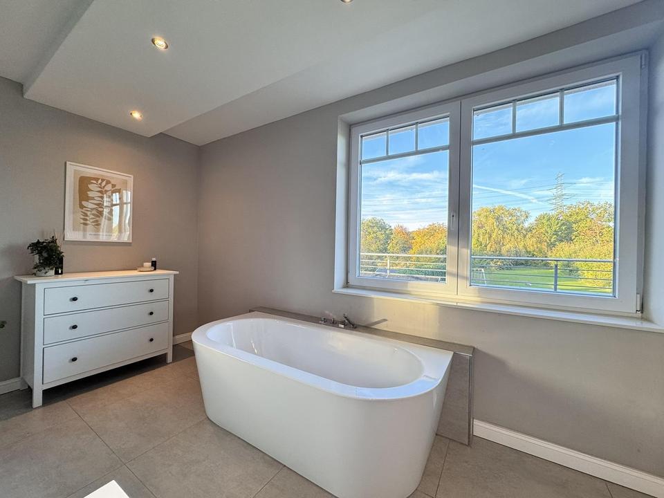 •Badkultur: Kinderbad als Duschbad; Master-Bad als Vollbad mit großem Waschtisch, freistehender Wanne und sehr großzügiger, bodengleicher Regendusche. Sauna-Vorbereitung/Anschluss vorhanden.