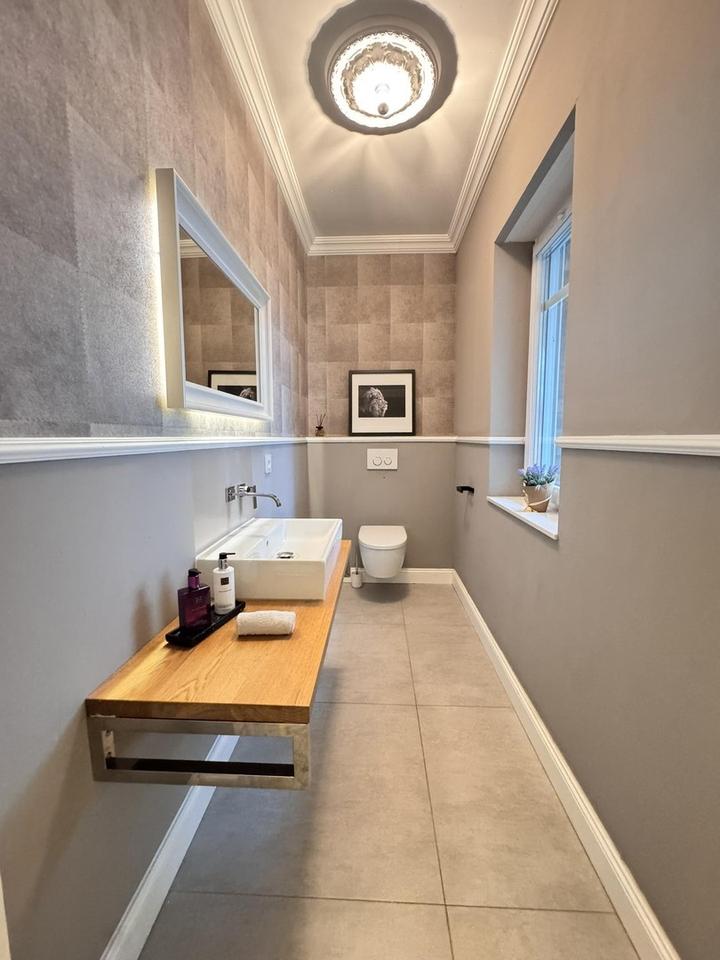 Im Erdgeschoss runden Hauswirtschaftsraum und Gäste-WC sowie ein großzügiges Arbeits-/Gäste- oder Sportzimmer (ideal als Home-Gym plus Home-Office) das Raumangebot ab. Die Deckenhöhe von 2,80m unterstreicht das luftige Wohngefühl. Im Obergeschoss befinden sich zwei sehr großzügige Kinderzimmer mit gemeinsamem Duschbad (jeweils en suite zugänglich) sowie die Master-Suite: ein helles Schlafzimmer mit Zugang zur Dachterrasse, ein effizient ausgebautes Ankleidezimmer und ein Vollbad en suite.